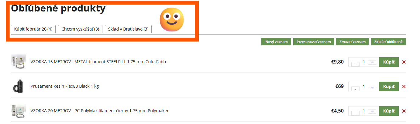 Srdce je symbolom Valentína. U nás má však ešte jeden význam – rýchlejší, prehľadnejší a inteligentnejší nákup filamentov a príslušenstva pre 3D tlač. Na Materialpro3d.sk sme pre vás ako darček k Valentínu pripravili jednoduchú funkciu, ktorá vám pomôže ukladať obľúbené produkty, vytvárať vlastné nákupné zoznamy a urýchliť opakované objednávky. Stačí byť prihlásený a kliknúť na ❤️ pri produkte. Vytvoríte si tak vlastný zoznam filamentov, resinov alebo náhradných dielov, ktorý môžete pomenovať, zdieľať alebo použiť ako podklad pre sklad, účtovníctvo či plánovanie výroby. Ak pravidelne nakupujete konkrétne PLA, PETG, ASA alebo technické materiály, túto funkciu si zamilujete.