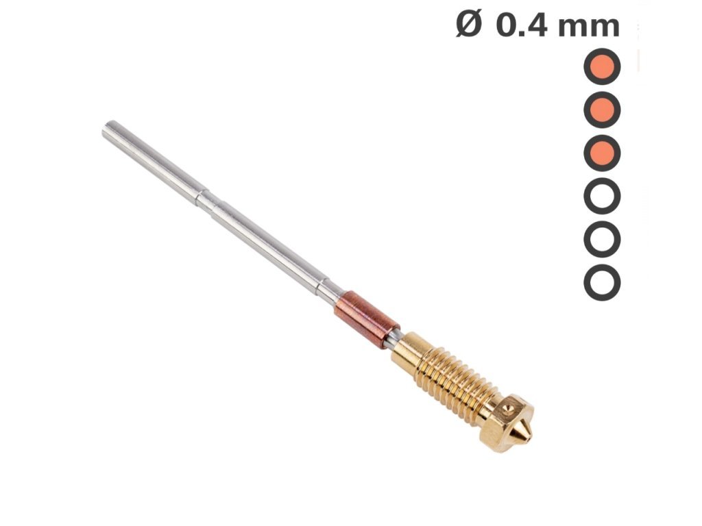 Nová generácia extruderov si žiada špeciálne trysky. Táto celokovová tryska vedie od podávacích koliesok až k podložke, už nie sú potrebné žiadne PTFE trubičky. Tým sa zvyšuje celková spoľahlivosť tlačiarne a výmena trysiek je oveľa rýchlejšia a jednoduchšia - vykonávať sa dá totiž za studena.
