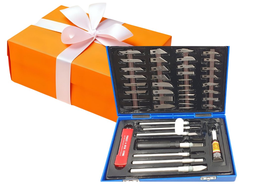 Sada modelovacích nožov 52 dielov sa samozamykacími rukoväťami. Súprava je určená najmä na presné řezávání plastov, kože, papiera a pod. Je vyrobená z kvalitnej ocele. Vhodné pre použitie v modelárstvo, 3D tlače, obuvníci, pri dekoráciách a iných oblastiach, kde je potreba presné a kvalitné vyrezávanie.