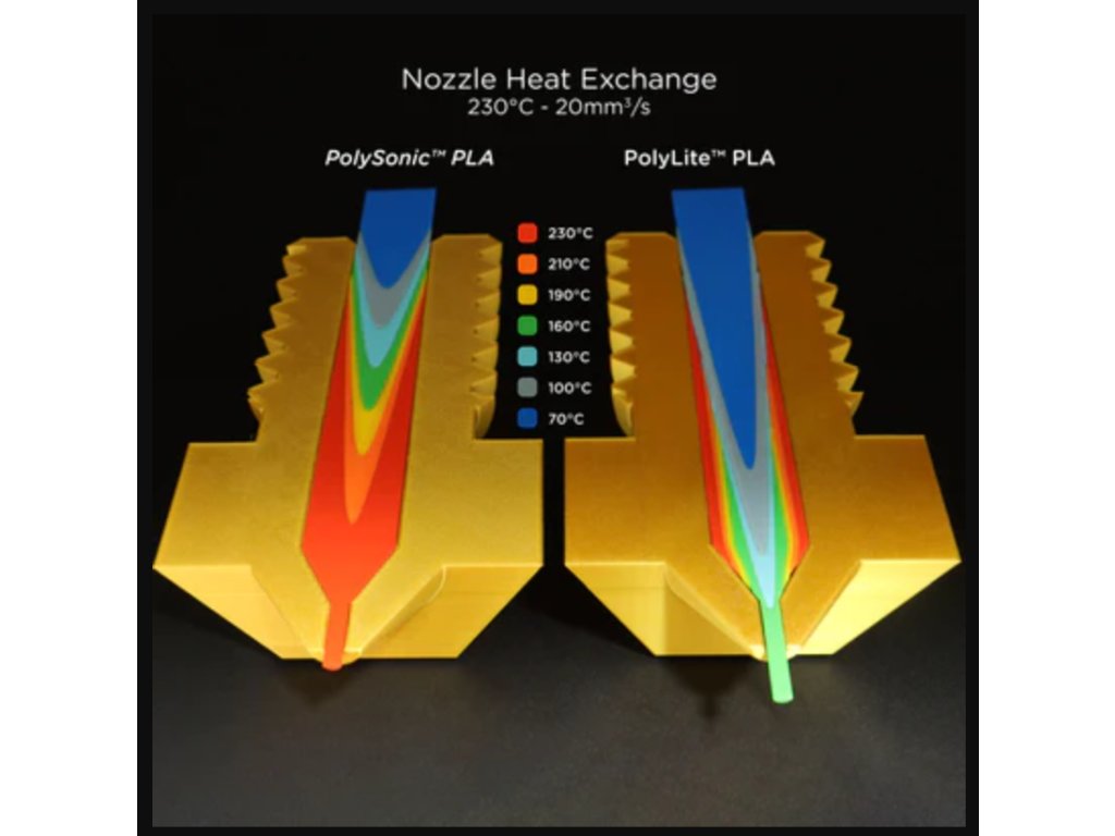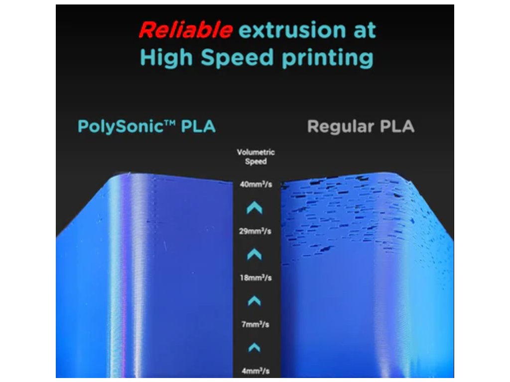 - Optimálna tekutosť: Filamenty PolySonic sú testované výrobcom na konzistentné tavenie pri prietoku 24 mm3/s