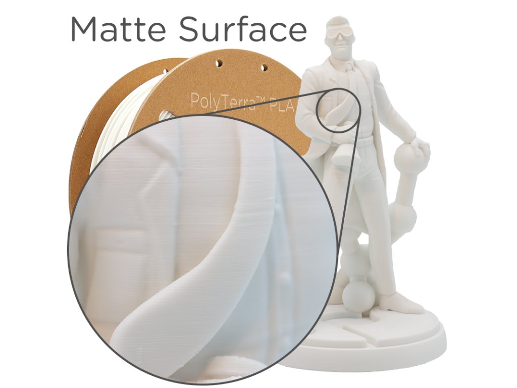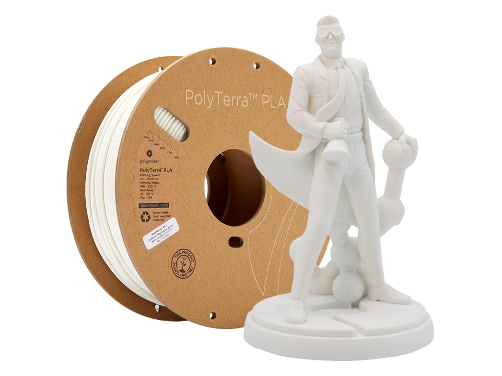 PolyTerra ™ PLA je nová ekologickejšia generácia filamentov od spoločnosti Polymaker, ktorá je od základu navrhnutá tak, aby bola šetrná k životnému prostrediu. Je kombináciou organických minerálov a PLA, čo výrazne znižuje obsah plastov a vytvára ekologickejšie 3D tlačový materiál. Tento materiál sa tlačí rovnako ako PLA, takže nebudete musieť meniť žiadna tlačová nastavenia. Navyše v niektorých vlastnostiach (napríklad premostenie alebo previs) dosahuje lepšie výsledky ako klasické PLA. Výsledný výtlačok má krásne matný povrch, čo lepšie skryje línie vrstiev.