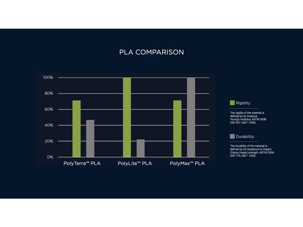 Mechanické vlastnosti PolyTerra ™ ponúkajú širokú škálu potenciálnych aplikácií, pretože materiál je tvrdší ako bežné PLA, ale zároveň si udržiava rovnakú tuhosť ako PolyMax PLA. Mimoriadna húževnatosť tohto materiálu vám umožní tlačiť čokoľvek od figúrok až po rôzne príslušenstvo. Vyznačuje sa tiež veľmi jednoduchým odstránením suportov. To všetko umožňuje posúvať hranice vašich výtlačkov a vytvárať stále zložitejšie modely, ktoré sú funkčné, odolné a matné. Výsledné výtlačky možno ľahko brúsiť.