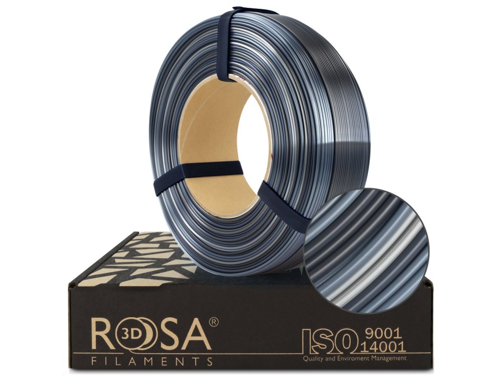 Tlačová struna bez cievky od značky Rosa3D: PLA Rainbow Silk Moon od Rosa3D je viacfarebný filament v odtieňoch tmavo modrej, čiernej, grafitovej a mesačnej ocele. Tento refill má lesklý povrch, krásne odráža svetlo a dodáva potlačám vizuálnu jemnosť. Jedna cievka s čistou hmotnosťou 800g obsahuje takmer 5 plných farebných cyklov.