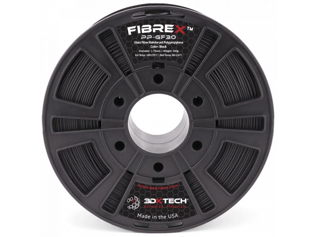 FibreX ™ PP + GF30 je vyrobený za použitia špeciálneho polypropylénového kopolyméru vystuženého 30% sklenými vláknami, ktorý bol vytvorený špeciálne pre 3D tlač. Toto zloženie ponúka zlepšené tepelné vlastnosti, nižšia zmrštenie a deformácii v porovnaní s ostatnými zlúčeninami na báze PP.