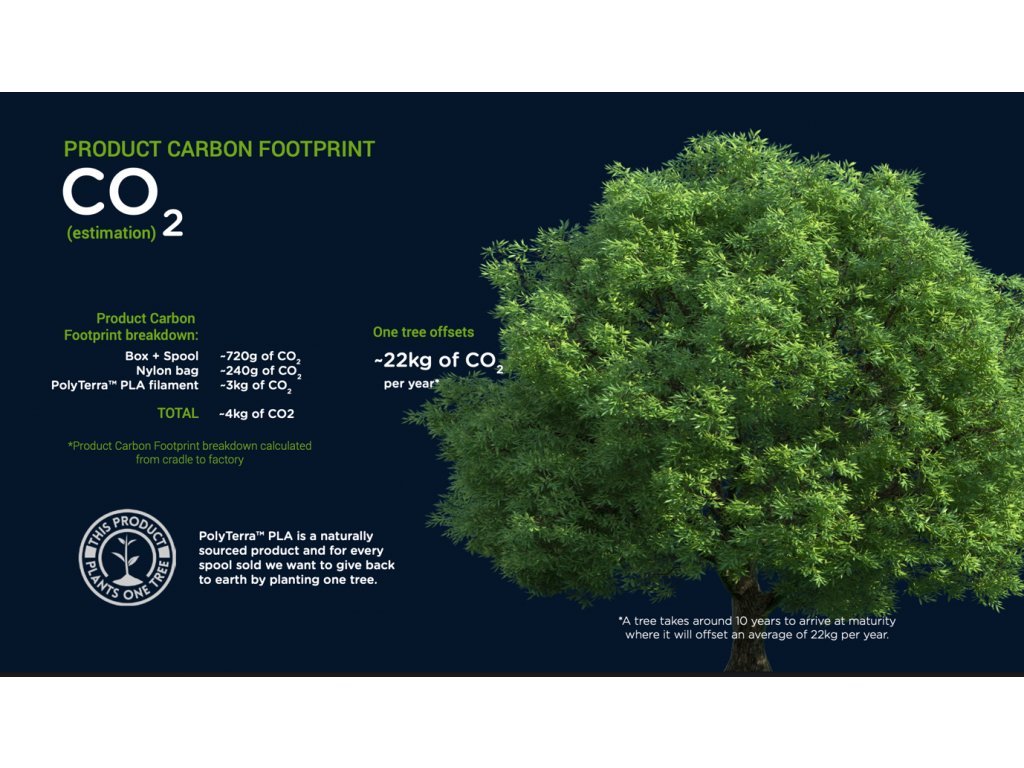 Za každú predanú cievku zasadí spoločnosť Polymaker jeden strom, aby sa znížila uhlíková stopa po výrobe tohto produktu. Akonáhle strom dosiahne dospelosť, má schopnosť nasať každý rok 22 kg oxidu uhličitého a vyrovnať tak 4 kg potrebné na vytvorenie PolyTerra™.