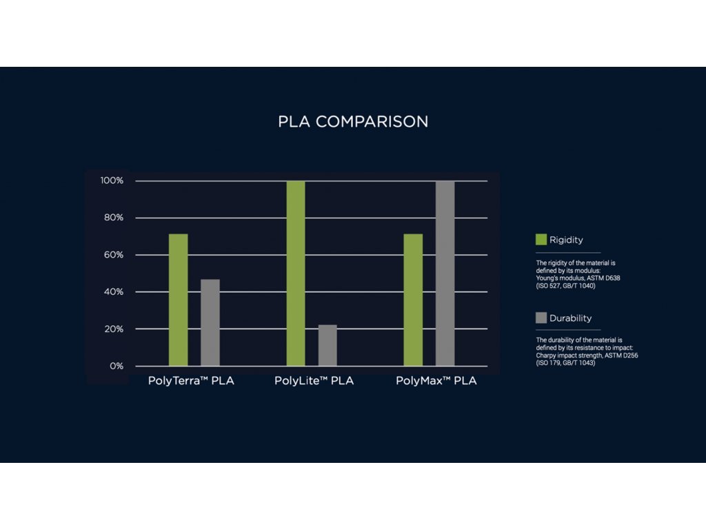 Mechanické vlastnosti PolyTerra ™ ponúkajú širokú škálu potenciálnych aplikácií, pretože materiál je tvrdší ako bežné PLA, ale zároveň si udržuje rovnakú tuhosť ako PolyMax PLA. Mimoriadna húževnatosť tohto materiálu vám umožní tlačiť čokoľvek od figúrok až po rôzne príslušenstvo. Vyznačuje sa tiež veľmi ľahkým odstránením podpôr.