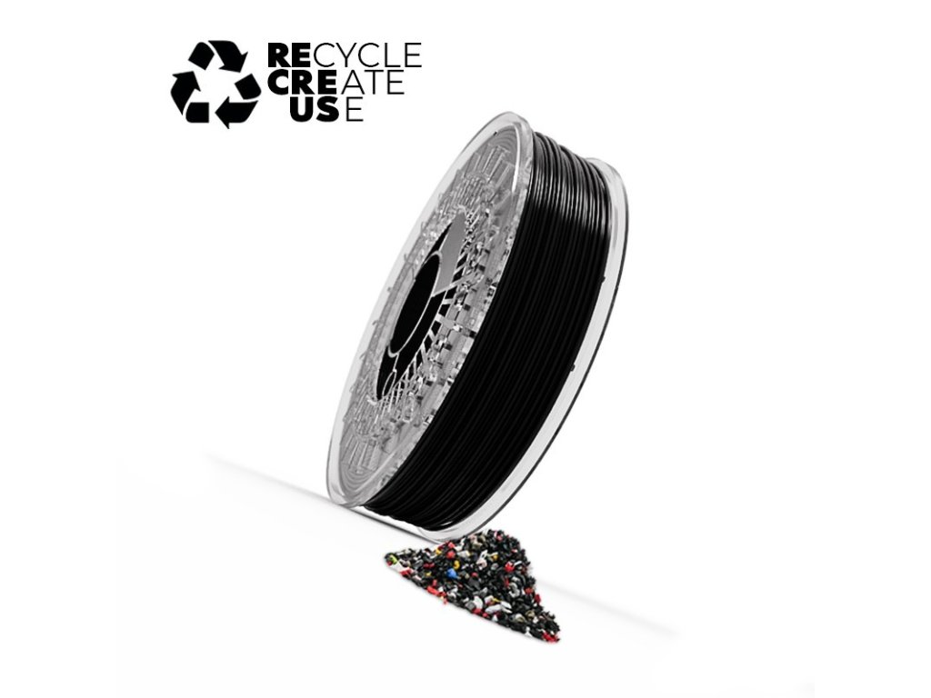 FDM tlačiarňami. Vzniká zmiešaním viacerých rôznych odtieňov recyklátu, preto je k dispozícii (po homogenizácii a pridanie čierneho pigmentu) iba v čiernej farbe.