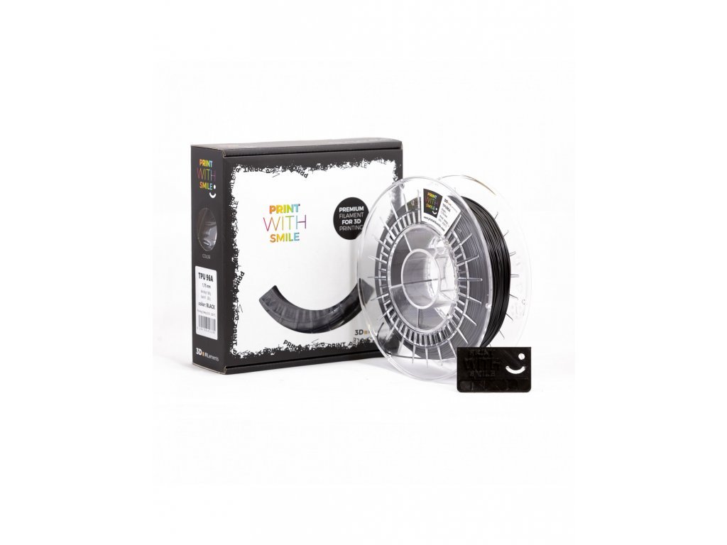 TPU 96A výrobca Print with Smile je elastomérna tlačová struna - kompozitný materiál, ktorý kombinuje vlastnosti gumy a iných termoplastov, ako sú PLA alebo ABS.
