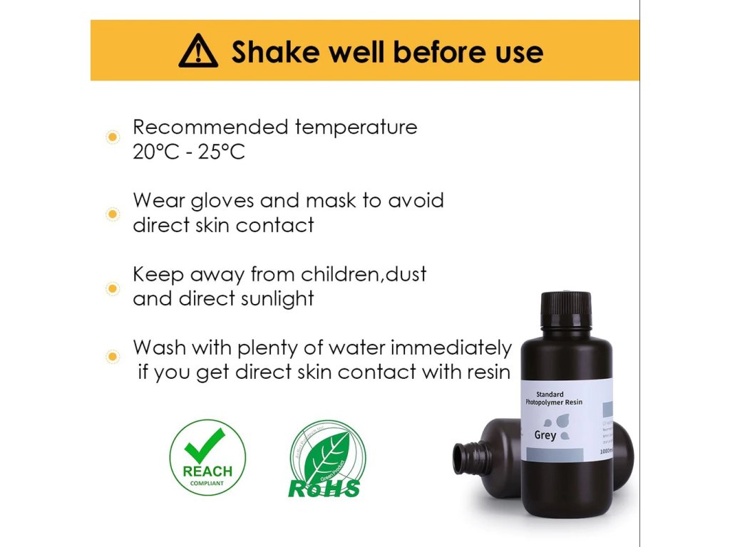 Nepriehľadná, kvalitne uzavretá fľaša je zabalená do plastového bublinkového vrecka a kartónovej krabice. Vďaka zdokonalenému zloženiu majú živice ELEGOO iba veľmi ľahký zápach.